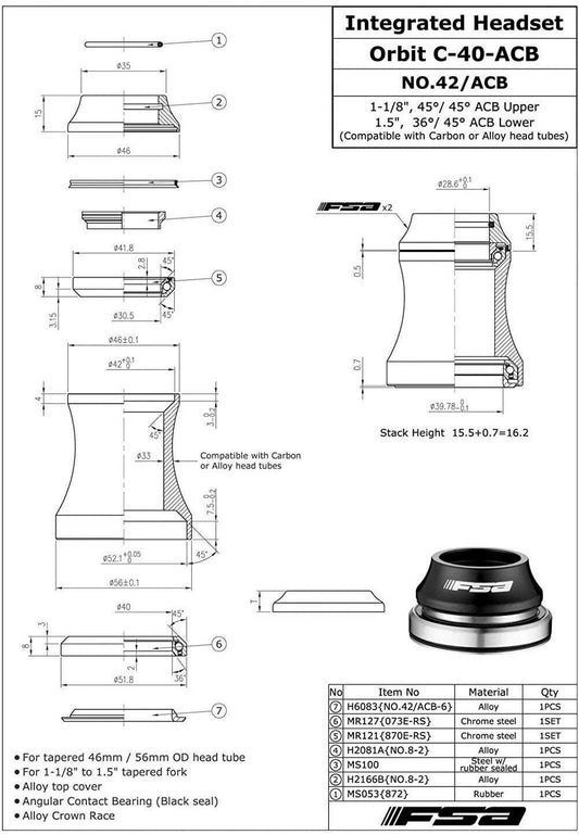 Bearing Kit For FSA No.42, No.42/ACB, ORBIT CF-40, ACB-CX, (1-1/8" to 1.5" IS42 / IS52 Tapered)